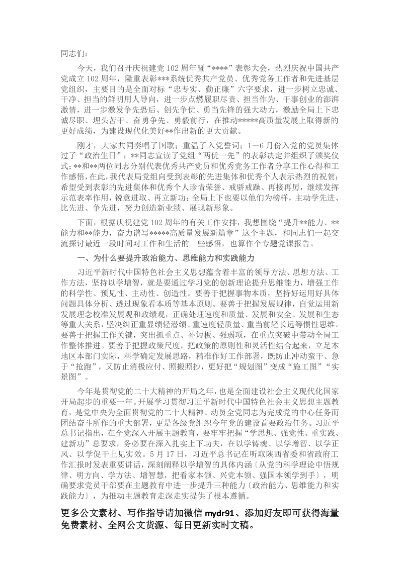 同志们:今天,我们召开庆祝建党102周年暨“**”表彰大会,热烈庆祝中国共产党成立102周年,隆重表彰**系统优秀共产党员、优秀党务工作者和先进基层党组织,主要目的是全面对标“忠专实、勤正廉”六字要求,进一步树立忠诚、干净、担当的鲜明用人导向,进一步点燃履职尽责、担当作为、干事创业的澎湃激情,进一步激发争先恐后、创先争优、勇当先锋的强大动力,激励全局上下忠诚尽职、埋头苦干、奋勇争先、勇毅前行,在推动***高质量发展上取得新的更好成绩,为建设现代化美好**作出新的更大贡献。刚才,大家共同奏唱了国歌:重温了入党誓词:1一6月份入党的党员集体过了“政治生日”;*同志宣读了党组“两优一先”的表彰决定并组织了颁奖仪式:*和*两位同志分别代表优秀共产党员和优秀党务工作者分享工作心得和工作感悟,在此,我代表局党组向受到表彰的先进集体和优秀个人表示热烈的祝贺:希望受到表彰的先进集体和优秀个人珍惜荣誉、戒骄戒躁、再接再厉,继续发挥示范表率作用,锐意进取、再立新功:全局上下也要以他们为榜样,主动学先进、比先进、争先进,努力创造新业绩、展现新形象。下面,根据庆祝建党102周年的有关工作安排,我想围绕“提升**能力、*能力和**能力,奋力谱写***高质量发展新篇章”这个主题,和同志们一起交流探讨最近一段时间对工作和生活的一些感悟,也算作个专题党课报告。一、为什么要提升政治能力、思维能力和实践能力习近平新时代中国特色社会主义思想蕴含着丰富的领导方法、思想方法、工作方法,坚持以学增智,就是要通过学习党的创新理论提升思维能力,增强工作的科学性、预见性、主动性、创造性。要善于把握事物本质,坚持好运用好具体问题具体分析、透过现象看本质等基本原则。要善于把握发展规律,自觉运用新发展理念校准发展观和政绩观,正确处理速度和质量、发展和安全、发展和生态等重大关系,坚决纠正重显绩轻潜绩、重速度轻质量、重当前轻长远等惯性思维。要善于把握工作关键,突出抓重点、补短板、强弱项,在重点突破中带动全局工作整体推进。要善于把握政策尺度,把政策的原则性和灵活性结合起来,立足本地区本部门实际,科学确定发展思路,精准作好工作部署,既防止冲动蛮干、急于“抢跑”,又防止消极应付、照搬照抄,更好把“规划图”变成“施工图”“实景图”今年是贯彻党的二十大精神的开局之年,也是全面建设社会主义现代化国家开局起步的重要一年。开展学习贯彻习近平新时代中国特色社会主义思想主题教育,是党中央为全面贯彻党的二十大精神、动员全党同志为完成党的中心任务而团结奋斗所作的重大部署,更是各级党组织今年党的建设首要政治任务。习近平总书记指出,在全党深入开展主题教育,要牢牢把握“学思想、强党性、重实践、建新功”总要求,务必要在深入扎实上下功夫,在以学铸魂、以学增智、以学正风、以学促干上见实效。5月17日,习近平总书记在听取陕西省委和省政府工作汇报时发表重要讲话,深刻阐释以学增智的具体内涵〔从党的科学理论中悟规律、明方向、学方法、增智慧,把看家本领、兴党本领、强国本领学到手),明确要求党员干部要在主题教育中进一步提升三种能力〔政治能力、思维能力和实践能力),为推动主题教育走深走实提供了根本遵循。更多公文素材、写作指导请加微信mydr91、添加好友即可获得海量免费素材、全网公文货源、每日更新实时文稿。