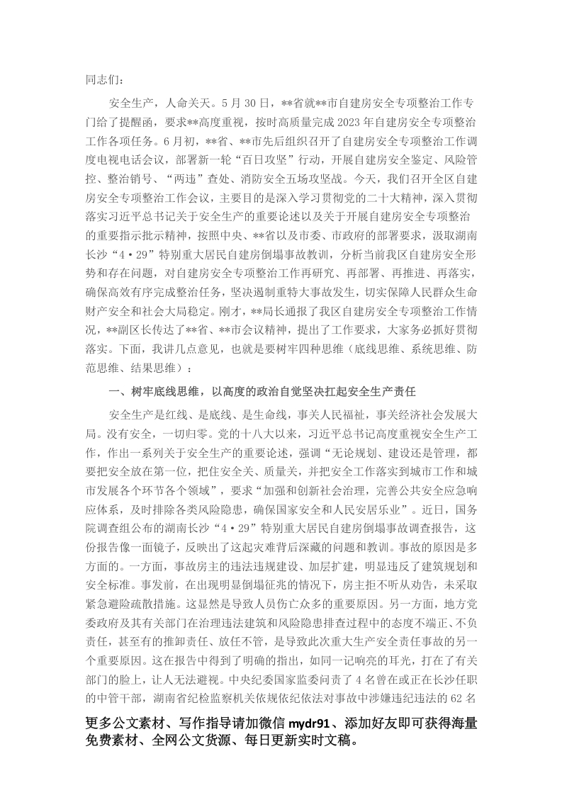 同志们:安全生产,人命关天。5月30日,**省就*市自建房安全专项整治工作专门给了提醒函,要求**高度重视,按时高质量完成2023年自建房安全专项整治工作各项任务。6月初,*省、*市先后组织召开了自建房安全专项整治工作调度电视电话会议,部署新一轮“百日攻坚”行动,开展自建房安全鉴定、风险管控、整治销号、“两违”查处、消防安全五场攻坚战。今天,我们召开全区自建房安全专项整治工作会议,主要目的是深入学习贯彻党的二十大精神,深入贯彻落实习近平总书记关于安全生产的重要论述以及关于开展自建房安全专项整治的重要指示批示精神,按照中央、**省以及市委、市政府的部署要求,汲取湖南长沙“4·29”特别重大居民自建房倒塌事故教训,分析当前我区自建房安全形势和存在问题,对自建房安全专项整治工作再研究、再部署、再推进、再落实,确保高效有序完成整治任务,坚决遏制重特大事故发生,切实保障人民群众生命财产安全和社会大局稳定。刚才,**局长通报了我区自建房安全专项整治工作情况,*副区长传达了*省、*市会议精神,提出了工作要求,大家务必抓好贯彻落实。下面,我讲几点意见,也就是要树牢四种思维(底线思维、系统思维、防范思维、结果思维):一、树牢底线思维,以高度的政治自觉坚决扛起安全生产责任安全生产是红线、是底线、是生命线,事关人民福祉,事关经济社会发展大局。没有安全,一切归零。党的十八大以来,习近平总书记高度重视安全生产工作,作出一系列关于安全生产的重要论述,强调“无论规划、建设还是管理,都要把安全放在第一位,把住安全关、质量关,并把安全工作落实到城市工作和城市发展各个环节各个领域”,要求“加强和创新社会治理,完善公共安全应急响应体系,及时排除各类风险隐患,确保国家安全和人民安居乐业”。近日,国务院调查组公布的湖南长沙“4·29”特别重大居民自建房倒塌事故调查报告,这份报告像一面镜子,反映出了这起灾难背后深藏的问题和教训。事故的原因是多方面的。一方面,事故房主的违法违规建设、加层扩建,明显违反了建筑规划和安全标准。事发前,在出现明显倒塌征兆的情况下,房主拒不听从劝告,未采取紧急避险疏散措施。这显然是导致人员伤亡众多的重要原因。另一方面,地方党委政府及其有关部门在治理违法建筑和风险隐患排查过程中的态度不端正、不负责任,甚至有的推卸责任、放任不管,是导致此次重大生产安全责任事故的另一个重要原因。这在报告中得到了明确的指出,如同一记响亮的耳光,打在了有关部门的脸上,让人无法避视。中央纪委国家监委问责了4名曾在或正在长沙任职的中管干部,湖南省纪检监察机关依规依纪依法对事故中涉嫌违纪违法的62名更多公文素材、写作指导请加微信mydr91、添加好友即可获得海量免费素材、全网公文货源、每日更新实时文稿。