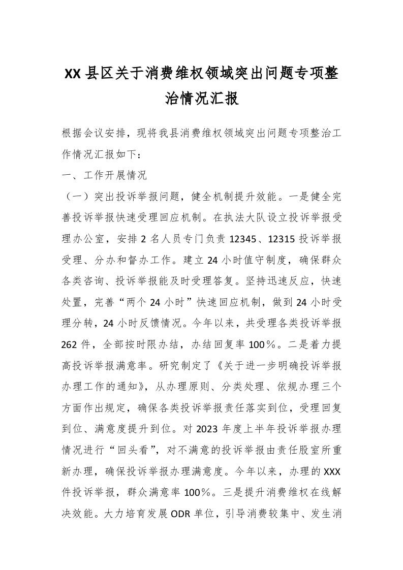 县区关于消费维权领域突出问题专项整治情况汇报根据会议安排,现将我县消费维权领域突出问题专项整治工作情况汇报如下:一、工作开展情况(一)突出投诉举报问题,健全机制提升效能。一是健全完善投诉举报快速受理回应机制。在执法大队设立投诉举报受理办公室,安排2名人员专门负责12345、12315投诉举报受理、分办和督办工作。建立24小时值守制度,确保群众各类咨询、投诉举报能及时受理答复。坚持迅速反应,快速处置,完善“两个24小时”快速回应机制,做到24小时受理分转,24小时反馈情况。今年以来,共受理各类投诉举报262件,全部按时限办结,办结回复率100%。二是着力提高投诉举报满意率。研究制定了《关于进一步明确投诉举报办理工作的通知》,从办理原则、分类处理、依规办理三个方面作出规定,确保各类投诉举报责任落实到位,受理回复到位、满意度提升到位。对2023年度上半年投诉举报办理情况进行“回头看”,对不满意的投诉举报由责任股室所重新办理,确保投诉举报办理满意度。今年以来,办理的XX件投诉举报,群众满意率100%。三是提升消费维权在线解决效能。大力培育发展ODR单位,引导消费较集中、发生消
